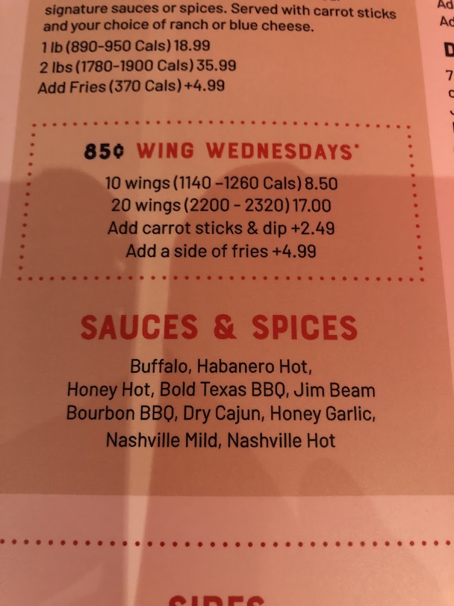 The wings were phenomenal!! I changed it up and I had asked if I could mix two flavors. I mixed Jack Daniels and Hot Habanero. The wings were big in size with lots of meat. There is also a large patio with lots of shade. Great place for drinks and food! Service was fast and friendly as well.